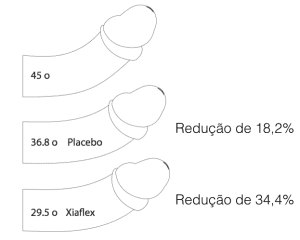 Sabemos que o efeito placebo (uso de soro fisiológico no lugar do Xiaflex) cria uma melhora de 18,2% da curvatura (Gelbard M, et al. J Urol. 2013 Jul;190(1):199-207). Desta forma se nós utilizar-mos o xiaflex em um paciente com 45o de curvatura ele irá ter um resultado final de 29,5o de desvio (melhora de 34,4%). Se nós utilizar-mos soro fisiológico (placebo) no lugar do xiaflex o resultado será de 36,8o de desvio (melhora de 18,3%). Para ajudar na visualização do resultado Xiaflex vs. Placebo coloco uma imagem com os resultados previamente citados ao final deste texto.